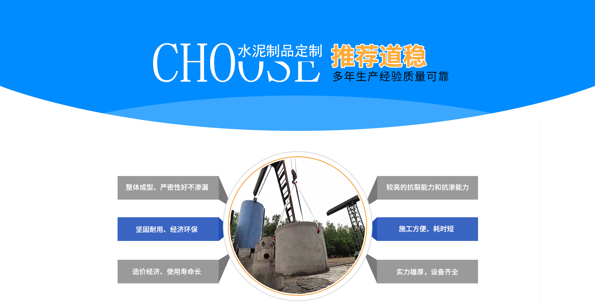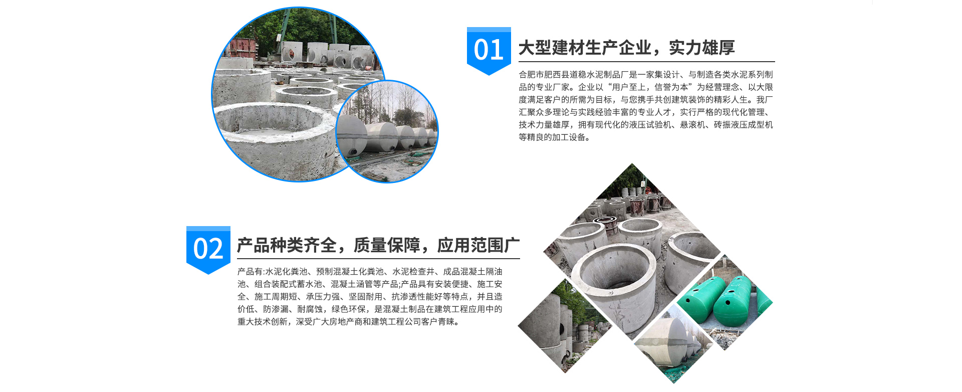 合肥市肥西縣道穩(wěn)水泥制品廠是一家集設(shè)計(jì)、與制造各類水泥系列制品的專業(yè)廠家。產(chǎn)品有:水泥化糞池、預(yù)制混凝土化糞池、水泥檢查井、成品混凝土隔油池、組合裝配式蓄水池、混凝土涵管等產(chǎn)品;產(chǎn)品具有安裝便捷、施工安全、施工周期短、承壓力強(qiáng)、堅(jiān)固耐用、抗?jié)B透性能好等特點(diǎn),并且造價(jià)低、防滲漏、耐腐蝕,綠色環(huán)保,是混凝土制品在建筑工程應(yīng)用中的重大技術(shù)創(chuàng)新,深受廣大房地產(chǎn)商和建筑工程公司客戶青睞。